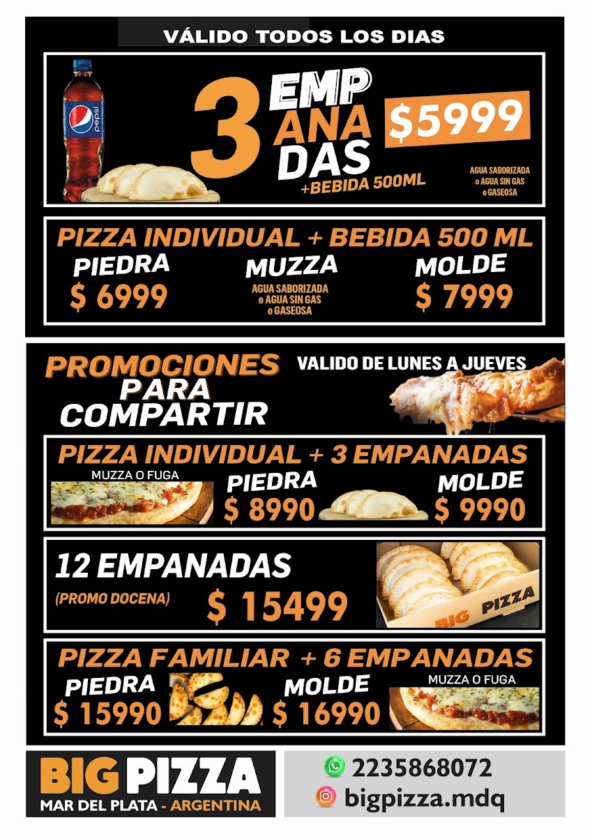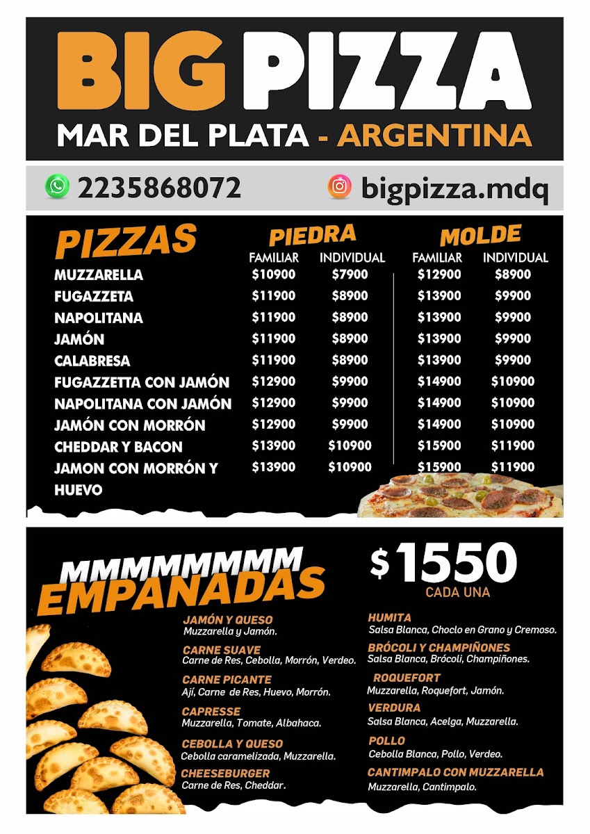 Welcome to BIG PIZZA, your go-to pizza takeaway spot in Mar del Plata, located on Av. Juan B. Justo 1791. Here, you can indulge in a variety of mouthwatering pizzas crafted with fresh ingredients. The menu boasts classic flavors like Muzzarella—a delightful combination of tomato sauce, mozzarella, oregano, and olives—and the tempting Fugazzetta, featuring caramelized onions.